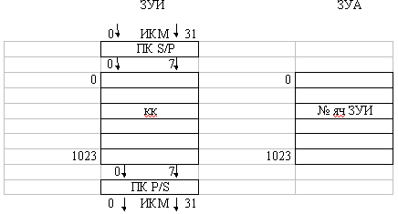 Рисунок 2.3 – Пример временной коммутации при втором режиме работы При записи информации по адресу КК записывается в ячейку соответствующую исходящему каналу т.е. Nяч.зуи=Nисх.к=7 Содержимое ячейки ЗУИ это КК в двоичном коде (восемь бит). Во временной момент соответствующий исходящему каналу происходит синхронное считывание информации из ячеек ЗУИ (из 0-ой ячейки в 0-ой канал, из 1-ой ячейки в 1-ой канал, и т.д., из 7-ой ячейки в 7-ой канал). При последовательной передаче сигнала в процессе коммутации максимально можно скоммутировать 128 временных каналов т.е. устройство коммутации позволяет коммутировать при этом 4 ИКМ тракта (32*4=128). Это связано с элементной базой. Для увеличения числа каналов коммутируемых в одном ВК (временном коммутаторе) осуществляется переход к параллельному способу передачи информации (КК передается параллельно по 8-ми проводам) в этом случае можно осуществить коммутацию (128*8=1024) каналов. Для преобразования последовательного кода (S) в параллельный (P) и обратно используются преобразователи кода ПК на входе и выходе ЗУИ. Рисунок 2.4 – Параметры ВК 32ЦЛ*32ЦЛ